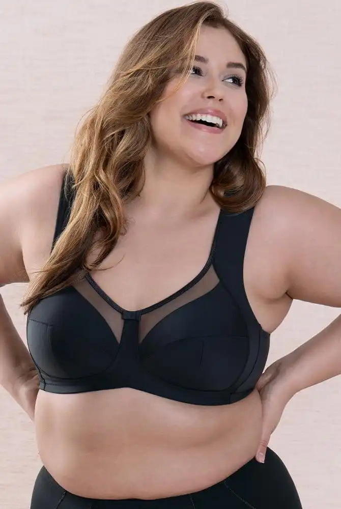 Das dreigeteilte Cup punktet durch seitlich gefütterte Blenden und die feste Rückenpartie geben dem großen Busen eine perfekte Stützwirkung und optimalen Halt. In großen Größen sind die Untercups zusätzlich doppelt gearbeitet und heben die Brust leicht an. Die Cups sind im oberen Bereich raffiniert mit elastischem Tüll verziert. Den Steg schmückt eine zarte Satinschleife.