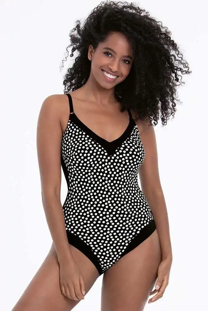 Mit Pünktchen ins Wasservergnügen! Der Badeanzug Mabela von Qualitätsmarke Rosa Faia aus der Bademoden-Serie Summer Dot versprüht mit graphischen Minidots in modischem Schwarzweiß und einem chicken V-Ausschnitt nicht nur 50ies-Glamour pur, sondern bringt mit optisch verschlankenden Uni-Blenden die Figur besonders vorteilhaft zur Geltung. Für optimalen Halt bis in große Cups sorgen ein Unterbrustband sowie verstellbare Träger. Die überzeugende Kombination aus puristischem Design und graphischem Print machen den Rosa Faia Badeanzug zum ultimativen Strandbegleiter.