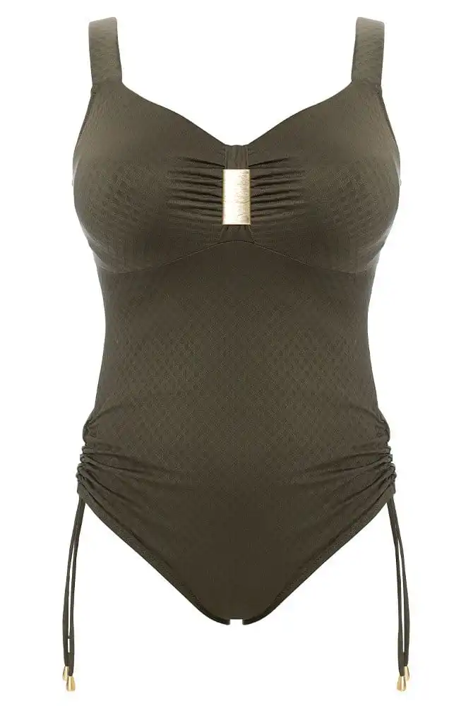 Der attraktive Badeanzug trägt sich angenehm komfortabel und überzeugt durch eine funktionale Schnittführung sowie raffinierte Details für große Größen. Ihr Dekolleté wird durch leichte Raffungen hübsch betont und verziert mit einem Schmuckdetail in Silber raffiniert in Szene gesetzt.